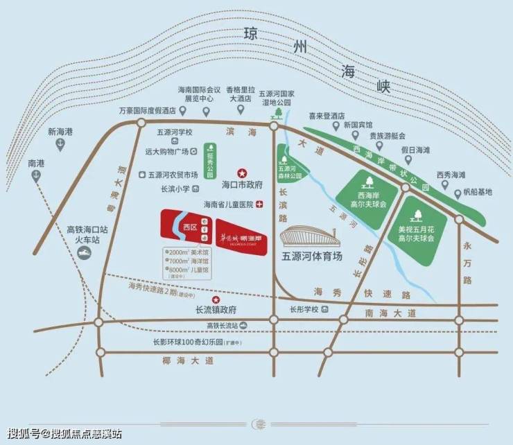 华侨城曦海岸择址于西海岸的重要区域,距离上比较靠近海口市政府行政中心,项目斜对面就是五源河体育场,并配套“一场十一馆”的文体设施。项目周边有四通八达的“6纵6横1轨道2港口”高速路网及动车站毗邻,社区旁边还有复旦大学附属儿童医院海南分院等大型的设施。目前,有公交车到五源河体育场下车,步行即可抵达项目所在地。