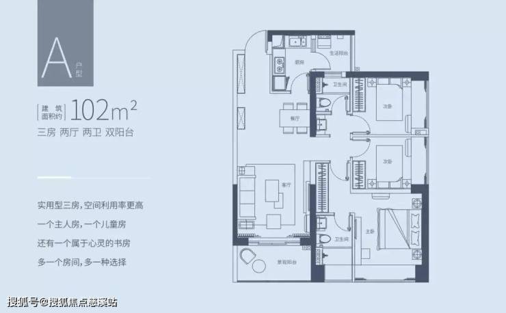 华侨城曦海岸A户型3室2厅2卫建筑面积102㎡