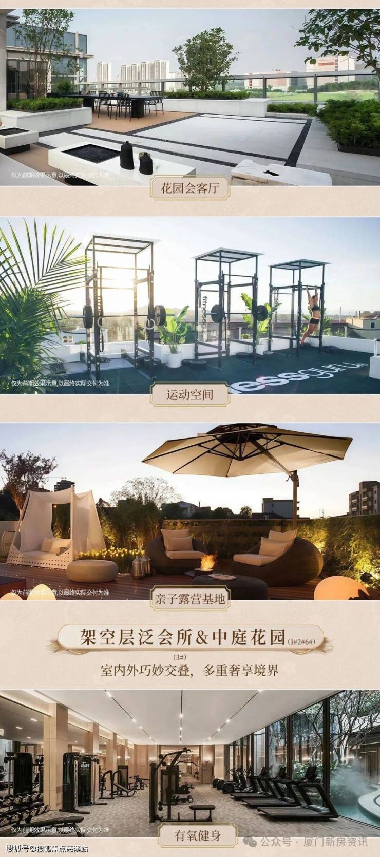项目社区规划了约5500㎡中庭园林、约480㎡地面泛会所、约850㎡空中花园。地面泛会所涵盖健身房、儿童体能训练中心、多功能室等,为居民提供全方位休闲娱乐空间。空中花园则设计了健身天地、星空观影等区域,满足亲子互动、邻里社交、独处放松等多样化需求。