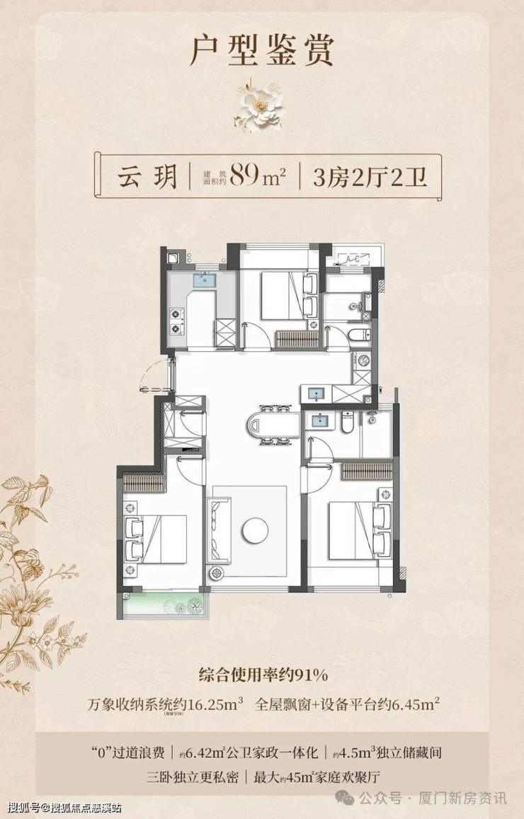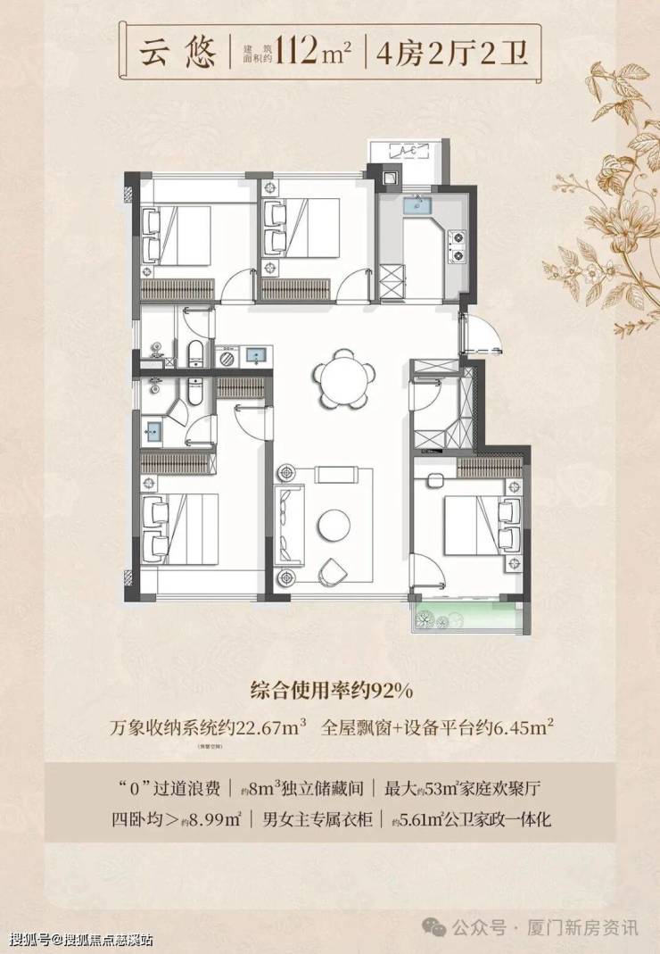 项目全1梯2户,都可以做到南北通透,约2.2容积率+纯洋房,全社区6-10层,采光大大提高,产品面积段为82-89-102-113㎡户型,共195套房源,户户综合使用率约90%。