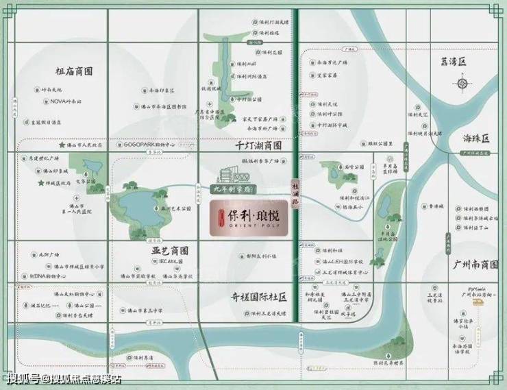 南海桂城新房保利琅悦地处石啃钢铁市场旧改南地块,行政归属桂城,西临亚艺湖,东接三龙湾,南望禅城奇槎板块,共享奇槎的生态资源与城市配套。交通路网发达,绿景三路、桂澜路等主干道快速连接桂城中心区、祖庙商圈和佛山新城,但轨道交通目前仍需依赖接驳——最近的3号线亚艺公园站约2公里,需电动车接驳;在建的4号线石啃站距离约1.5公里。
