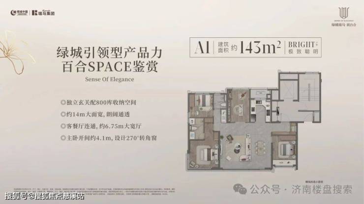 143㎡三/四室:独立玄关+800库收纳空间;约14米面宽;客餐厅连通,约6.75大宽厅;主卧开间约4.1米,带270度拐角落地窗。缺点是有两个北卧。