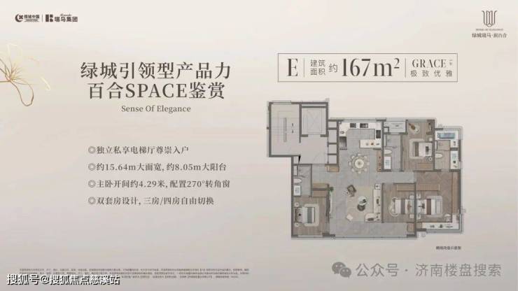 167㎡三/四室:私享电梯厅;约15.4米面宽,约8.05米阳台;主卧开间约4.29米,270度拐角窗;双套房。