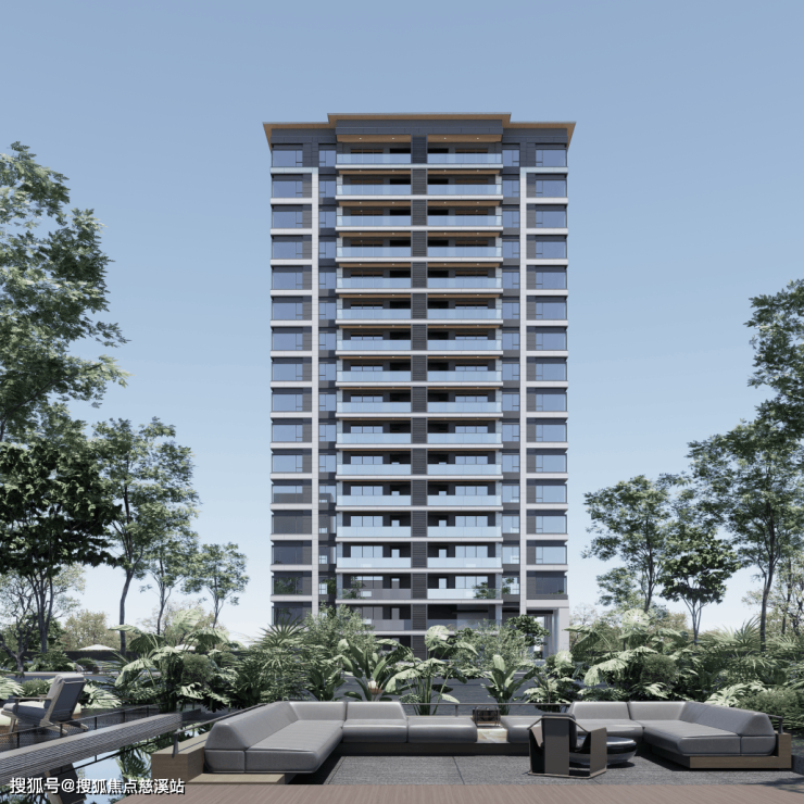 塔楼采用现代中式风格,突破传统造型,与现代建筑的设计手法相融合,兼容性较强,外形现代但具备中式韵味,强调简洁线条的特点,注重横向与竖向线条的韵律感,线条排布整洁舒展,以简单的线条表现现代中式的古朴大方,基座以幕墙类材质为主,金属为辅,灰色线条勾边,屋顶采用漂浮感挑檐设计,呈现出与众不同的东方审美。在建筑色彩上,采用朴素典雅灰白金的颜色,追求古朴而不失现代的亲和感,给人优雅温馨、自然脱俗的感觉。