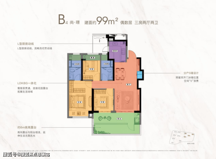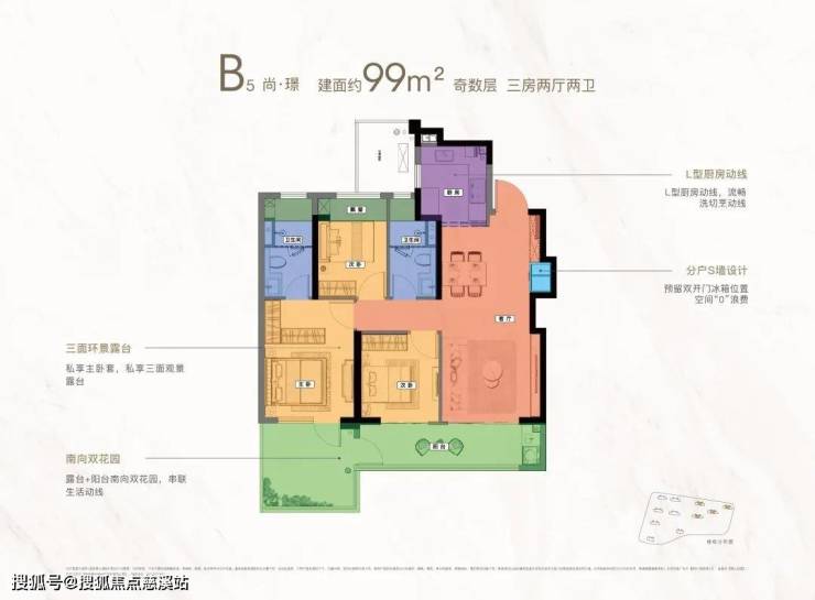 其次,起步户型建面约99㎡三房,低总价+户户带露台。
