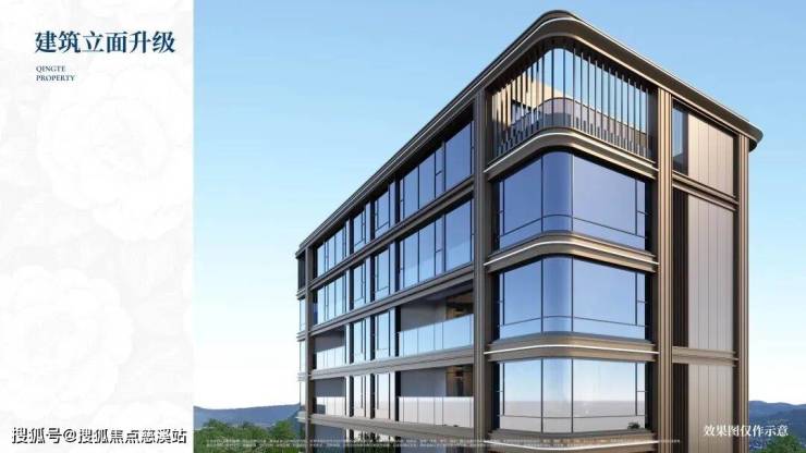 建筑立面采用南向铝板+LOW-E玻璃,搭配香槟金色金属线条,整体轻盈现代,充满镜面艺术感。