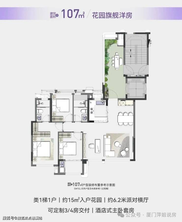 户型面积:建面约 63㎡2 房、79-87㎡3 房两卫、107㎡3-4 房两卫带入户花园、115㎡4 房两卫带入户花园。
