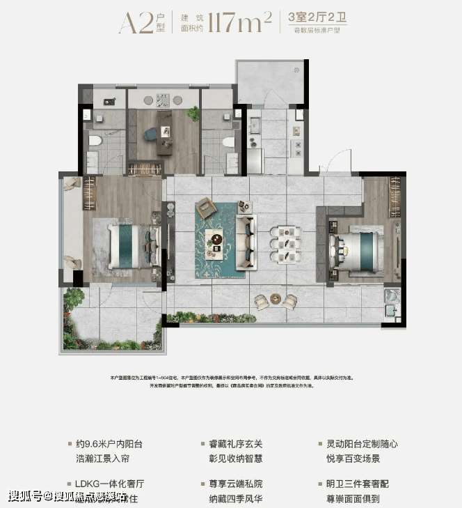 江核首个纯粹小高层四代宅,均为建面约117㎡户型,户户有露台,近100%得房率,使用体验媲美市面上建面约140㎡户型。