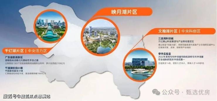 [太阳]映月湖——鼎立桂城的三湖之一,也是未来新发力点,广佛中心C位千灯湖-映月湖-文翰湖,三湖架起桂城城市发展格局。作为广佛同城极核C位,映月湖是桂城发展的腰部板块,城市发展新核心。其中映月湖中央人文区,未来10年投入约2千亿推进文化:社区、产业、交通、民生、生态六大工程。