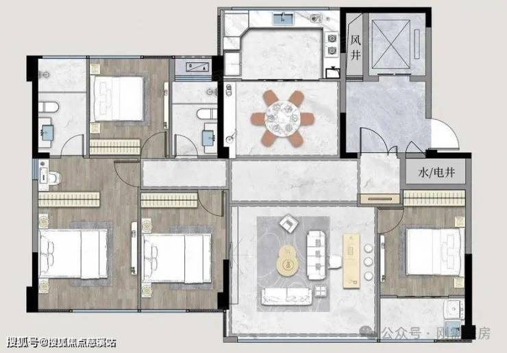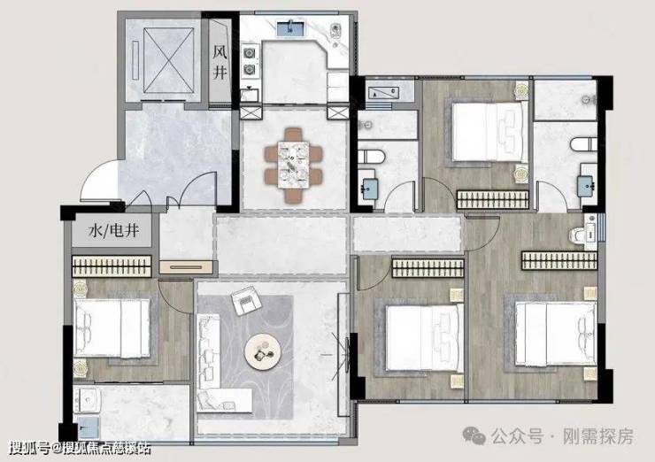 145平:四房两厅两卫,128平的升级版,客餐厅的面宽拉大,其他就没有太多变化了。