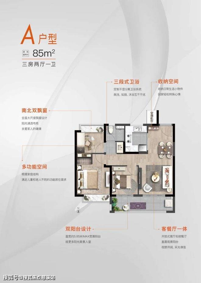 建面约85㎡ 三房两厅一卫 ,餐客厅一体化,动线自然;厨房空间设计为U型,活动、储物空间相对充足。南向双阳台设计,阳台约5.85米,连接客厅和次卧,活动空间自如、采光也充足。主卧带飘窗,相对增加了储物空间。浴室为干湿分离设计,保证了淋浴和日常盥洗时的舒适程度。