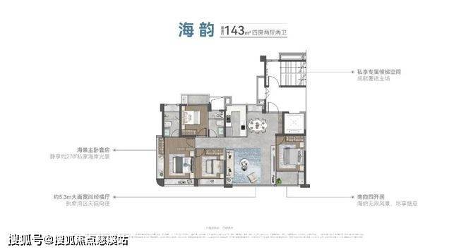 建筑面积约168㎡则超越大部分同级户型,实现了主卧双面瞰景、超72m中庭视距和74m瞰海景观面的三重优势。