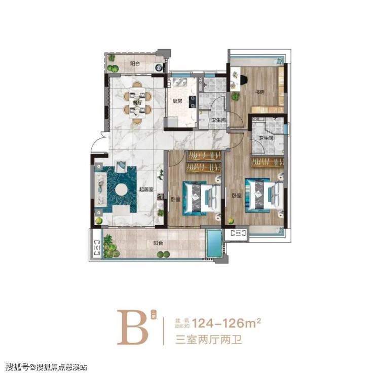 B户型亮点:全能三房,户型方正,宽景阳台规划温泉泡池