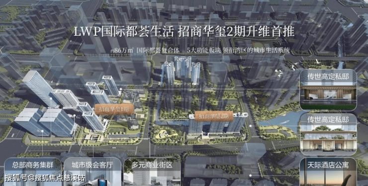 项目源自千灯湖宝华村旧改,约86万㎡连片开发实现千灯湖价值升维,商业、办公、公园、住宅等多业态融合,实现 “城市超核资源升级”的LWP高感社区。