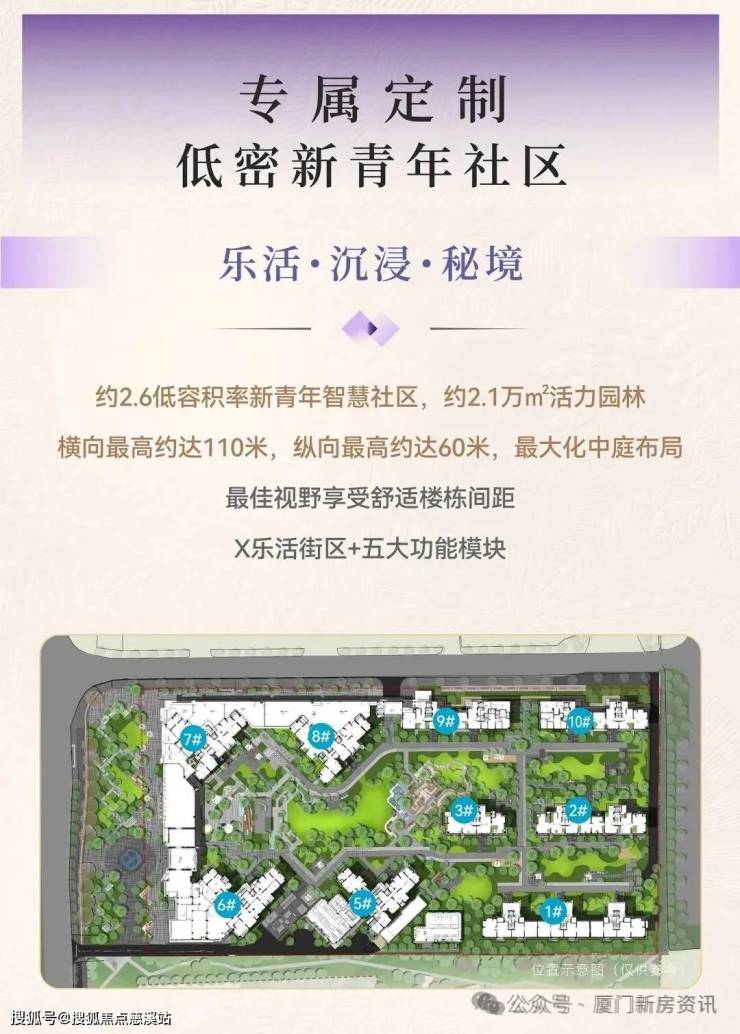 项目容积率约2.6,规划约2.1万㎡活力园林,楼间距较大(横向最高约110米,纵向最高约60米),最大化中庭布局。