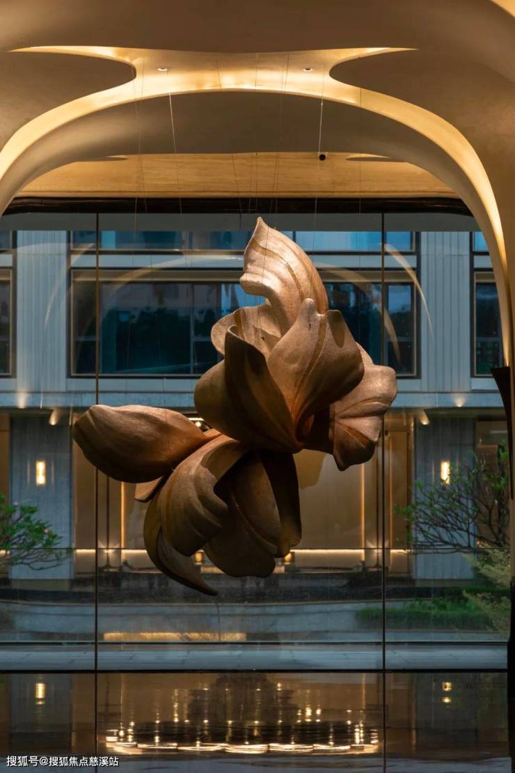 大堂入口雕塑以“白玉兰”为原型,以螺钿镶嵌、罩金、贴箔等工艺呈现,保留花朵廓形和银箔质感的同时,展现了优雅与宁静的意象美学。
