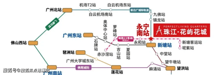 【23号线】(规划中):由增城坭紫站发出,与21号线官湖站交汇,链接增城开发区、长岭居、科学城和金融城,承担了增城、黄埔、天河、海珠之间的交通联系,被定义为城市产业生命线;