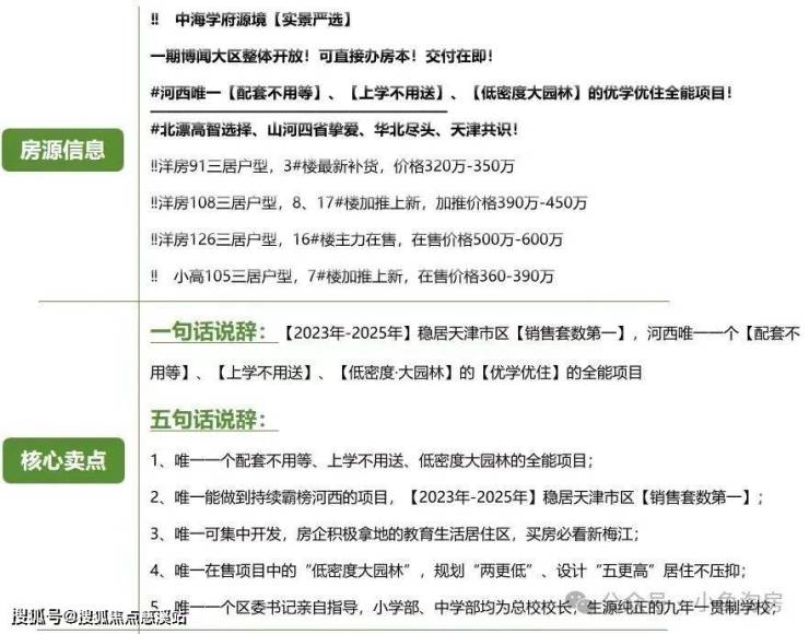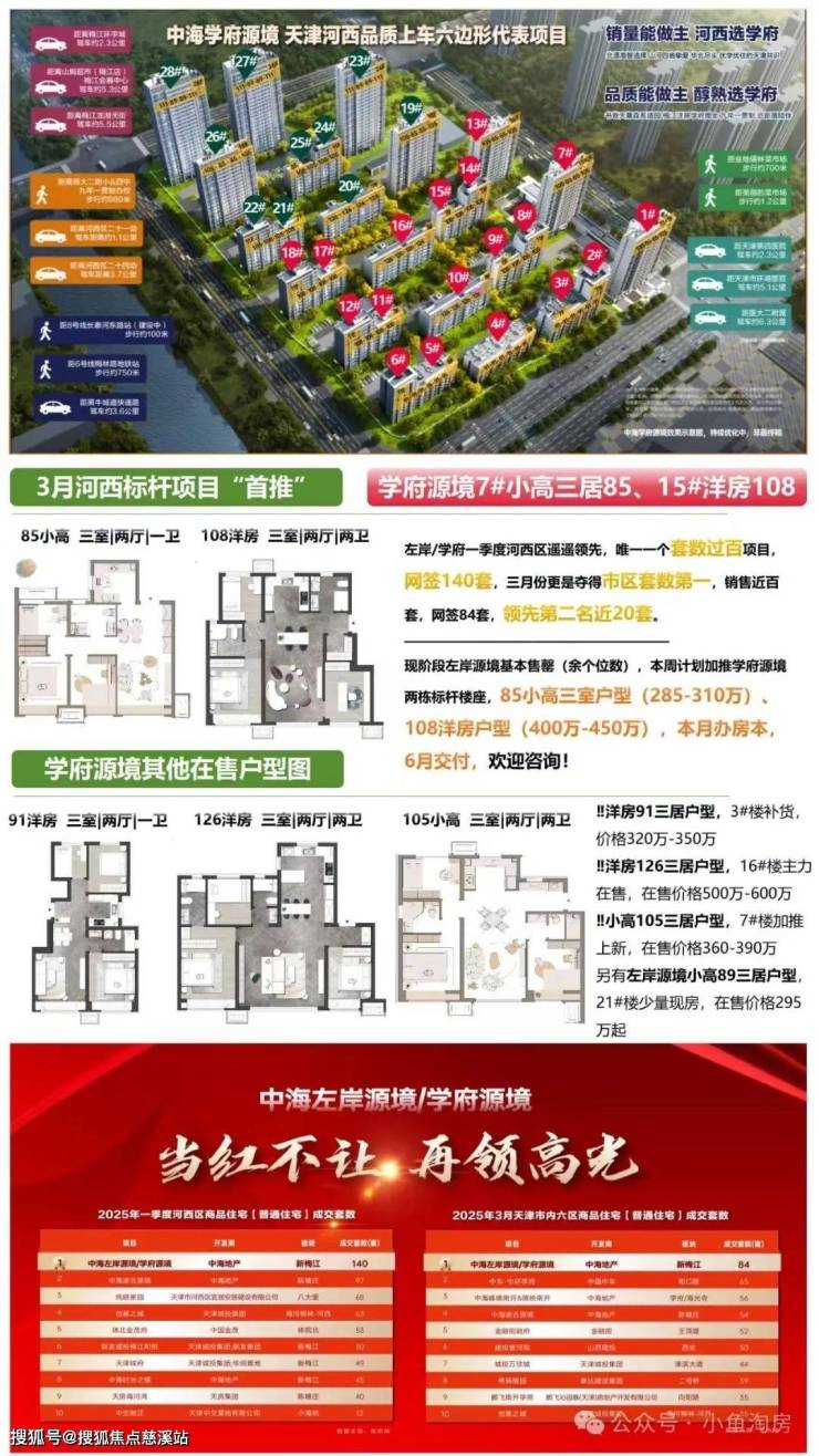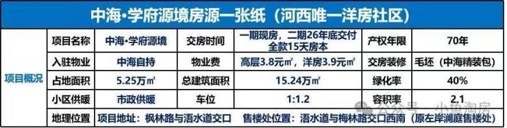 天津【中海·学府源境】项目基础信息:【项目规划】:项目总建筑面积约15.49万㎡【开发商名】:中海地产(国资央企,行业巨擘)【主要产品】:一期【博闻】为洋房、小高,二期【揽阅】为高层、小高、洋房【产权年限】:70年产权住宅【主要面积段】:【博闻】组团建面约85-126㎡,【揽阅】组团建面约89-126㎡;【梯户比】:小高2梯4户,洋房1梯2户,高层2梯4户【容积率】:整体容积率约2.1(一期容积率约1.8)【绿地率】:约40%【交付标准】:毛坯【车位比】:1:1.2【交房时间】:一期预计2025年6月30日(提前4个月),2025年4月可办理房本,二期预计2026年12月31日