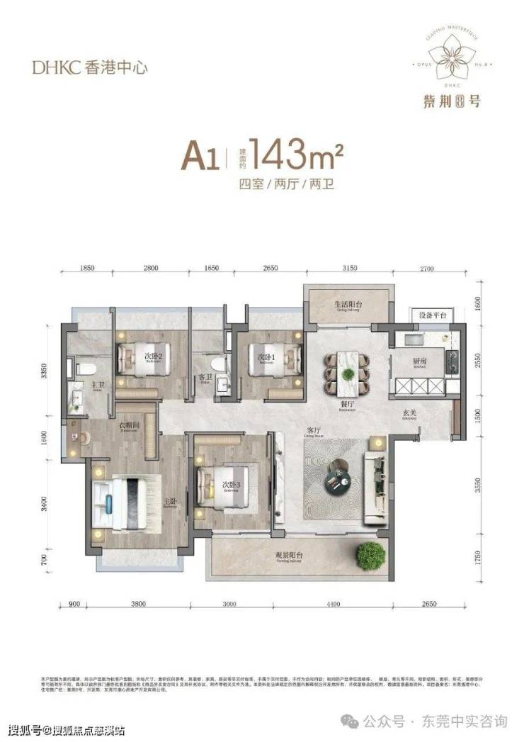 约143㎡四房两厅两卫(162套,占比66.7%):双阳台设计、南向超7米阳台、南向主卧设计