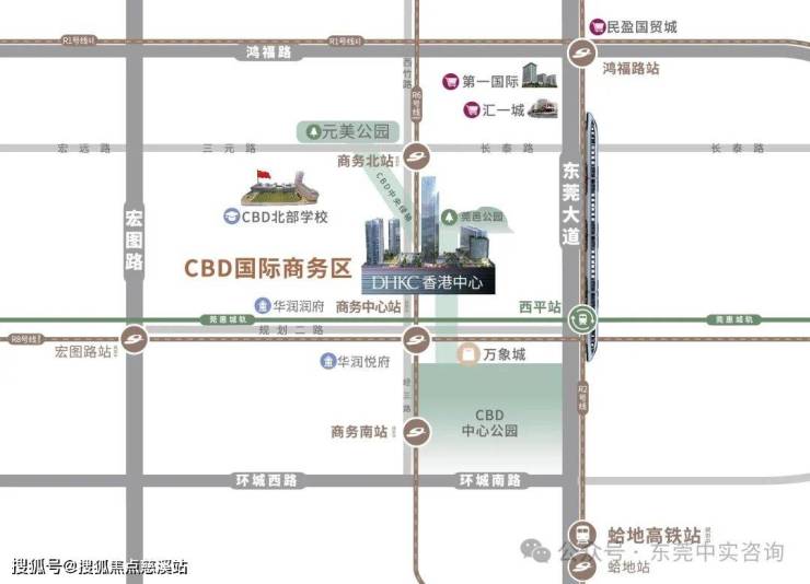 香港中心位于湾区都心—东莞国际商务区(东莞CBD),规划结构为“一心两轴四组团”,是东莞未来十年政府重点打造的最核心、最醇熟的中心区位,比肩深圳湾。项目旁边即为CBD北部学校、华润万象城、CBD中心公园、华润置地中心、莞商大厦等。预计将于 2030年、2035年全部建成,这里将是东莞的中心,类似“珠江新城”和“福田CBD”。