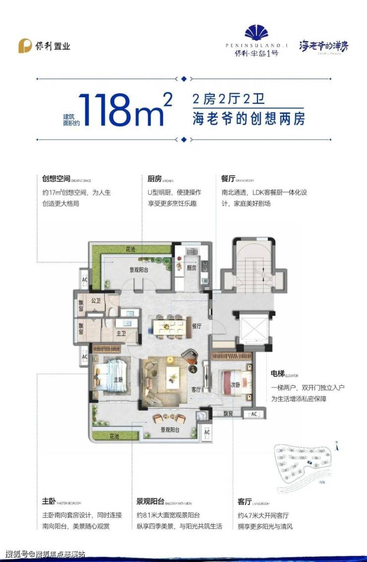 约8.1米大面宽阳台,约4.7米大开间,预留约17㎡创想空间
