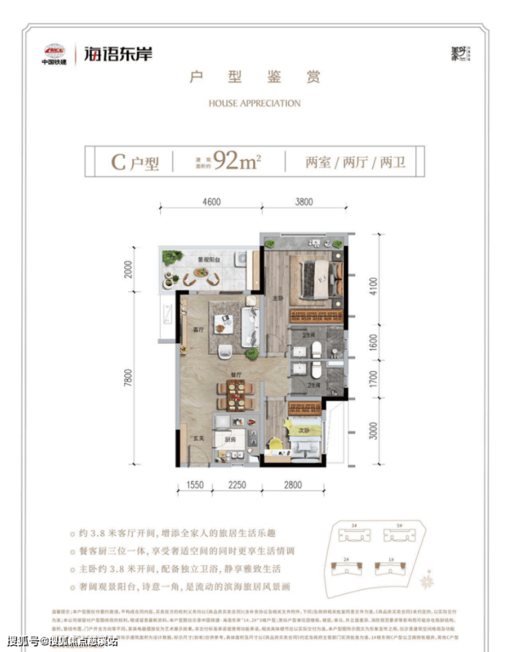 C户型:建筑面积约92㎡,两室两厅两卫。方正布局,功能分布科学合理,约3.8米客厅开间;餐客厨三位一体,室内通透、采光通风良好;主卧约3.8米开间,配备独立卫浴,静享雅致生活奢阔观景阳台。