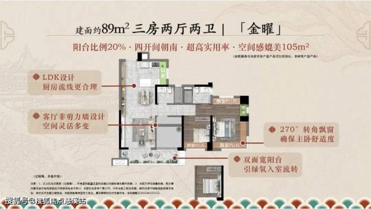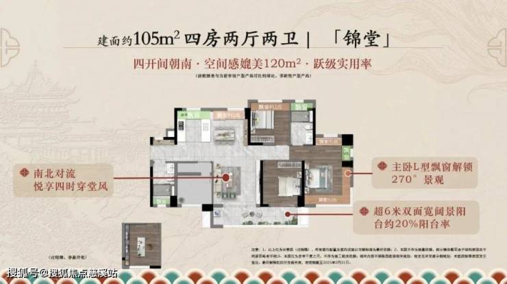 首推的105㎡的房源仅有2条梯腿,共59套。以南北对流、四开间朝南、超6米双面宽阳台、主卧带270°转角飘窗为亮点。