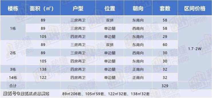 其中,1座为2梯5户,30层高,户型为89㎡三房及105㎡四房;2座为2梯4户,31层高,户型为89㎡三房及105㎡四房;3、14座均为2梯2户,17层高,其中3座主打138㎡四房户型,14座主打122㎡四房户型。