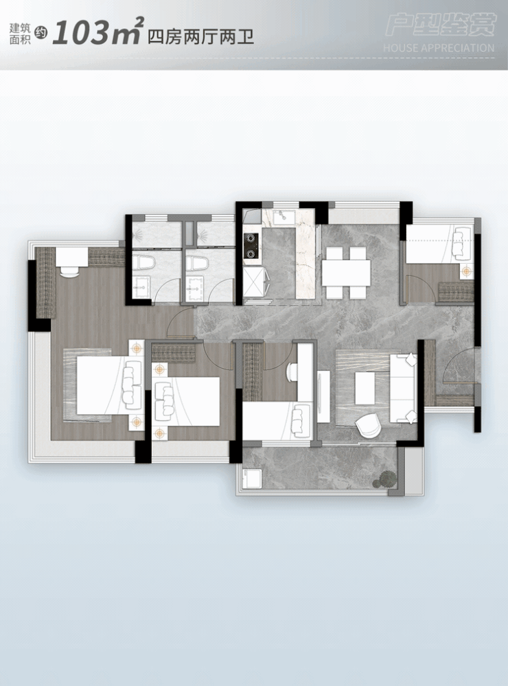 103㎡三房2厅2卫,五开间约14m采光,360°无立柱转角阳台