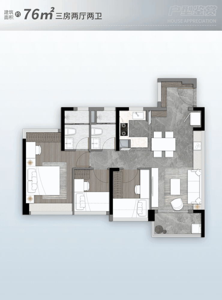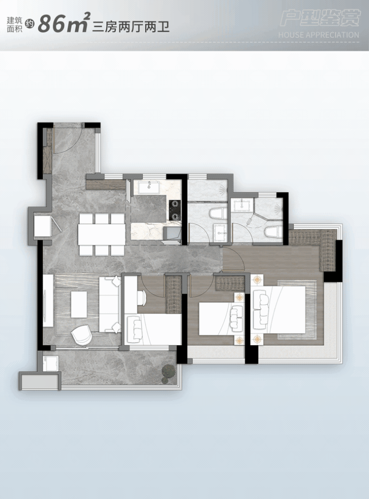 86㎡ 三房2厅2卫,南向四开间约 11.1m采光,主卧360°无立柱景观飘窗