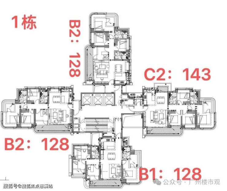 1号楼:户型分布上,1栋3条梯腿布局128平四房,另一条是143平四房。