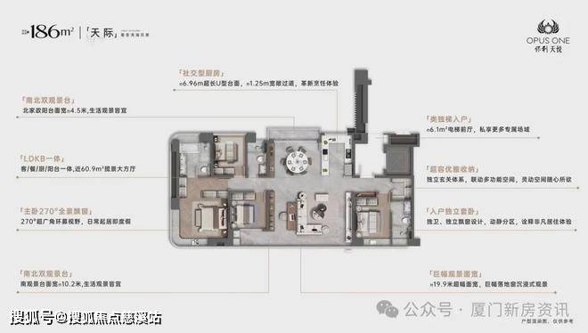 185㎡户型( 4房2厅3卫 ):独梯入户私属;独立玄关+独立鞋帽间超强收纳;近60.9㎡LDKB一体聚会厅设计;总长约19.9米超长景观面,客厅7.0米的大宽厅,约10.2米落地玻璃景观面;双套房设计;270°转角无柱飘窗观景主卧套房,主套卫尊享五件套;南北双阳台设计。
