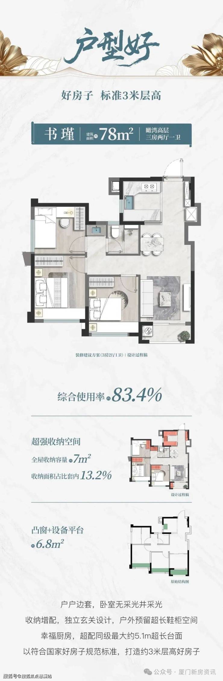 约3米层高好房子,采光面观景面更大,居住更舒适。3大迭代精装体系,超强收纳、幸福厨房,以创新产品力再造湾岸低密洋房住区。