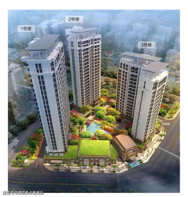 由三栋板式高层住宅及相关配套物业、临街低层商业环绕组成,内部为中央景观花园及泳池。