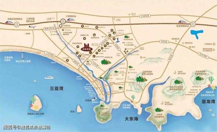 中投·悦府占据金鸡岭居住片区核芯制高点,北临金鸡路,东靠金鸡岭街,毗邻三亚城市主干道之一的凤凰路,临近三亚河,远眺金鸡岭及三亚湾,山、河、海景观资源俱备,是为三亚城心绝美珍稀席位。