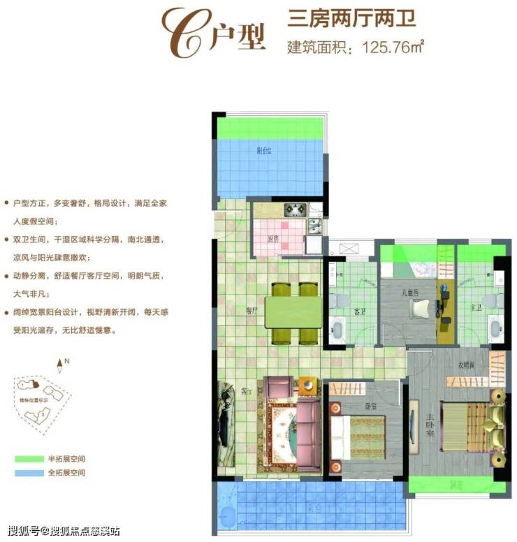C户型:125.76㎡三房两厅两卫