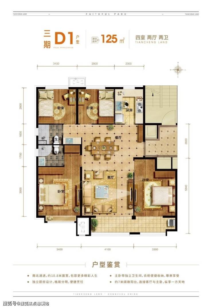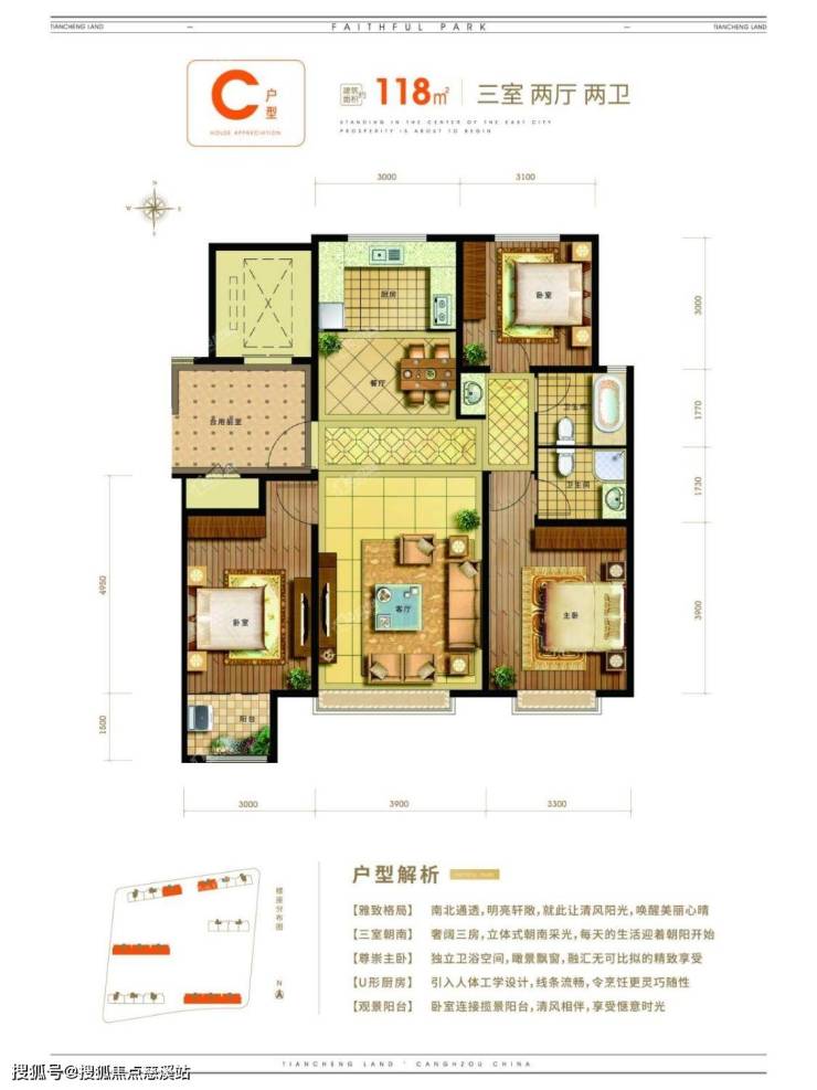 户型设计:全系大面宽户型,标配南向三面宽、贯穿式阳台,部分户型采用套房式主卧、三段式卫浴等高端配置。