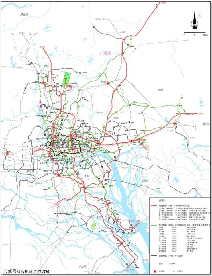 新线网规划显示,广州将打造5条高速地铁(广州境内452公里)、11条快速地铁(广州境内607公里)、37条普速地铁(970公里)形成“高速-快速-普速”三个层级、总里程达2029公里的城市轨道交通线网。