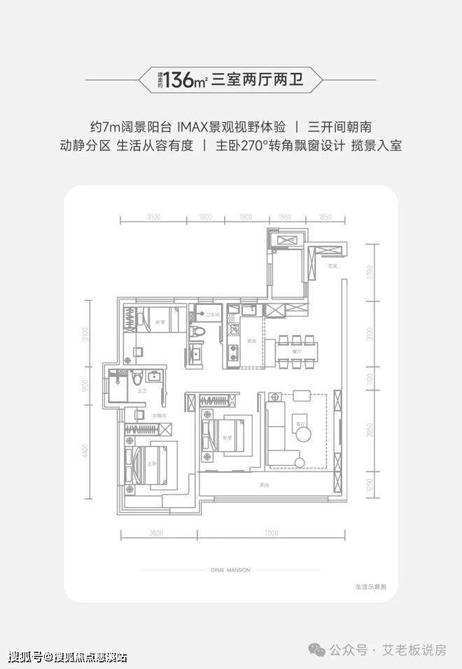 优点:将近7米的落地窗联通阳台,主卧270°的观景阳台,都是户型的亮点。