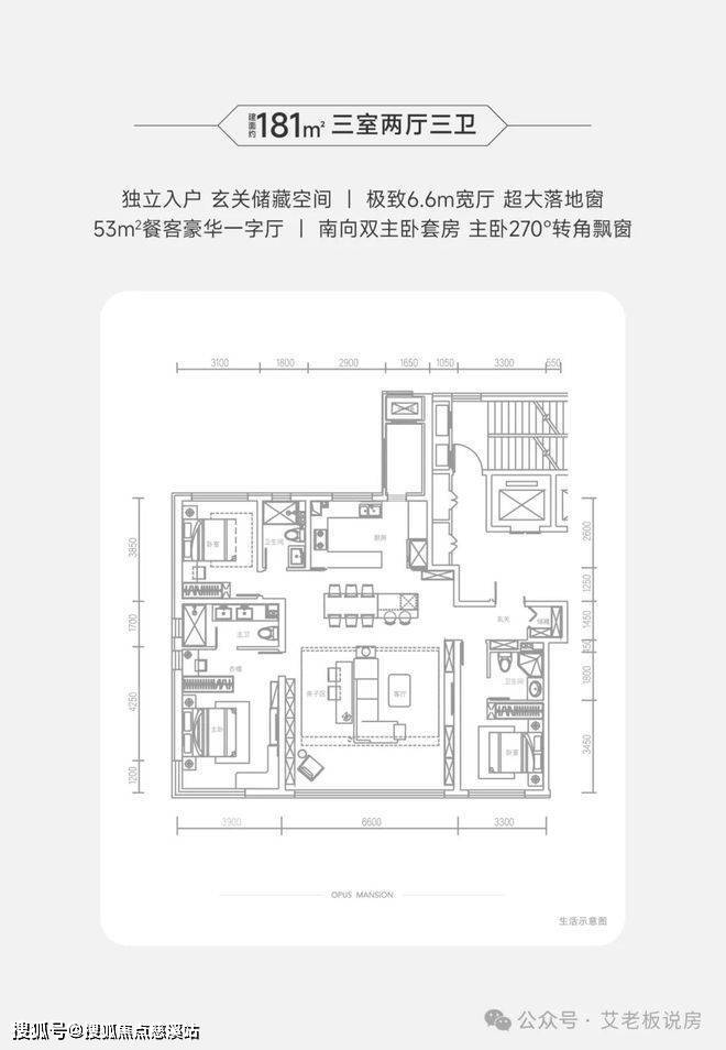 优点:6.6米联通阳台,而且是大落地窗,通体玻璃,采光好,视野通透。还做了可变宽厅的设计,把客厅和卧室的墙体去掉,就是宽厅两居的设计。