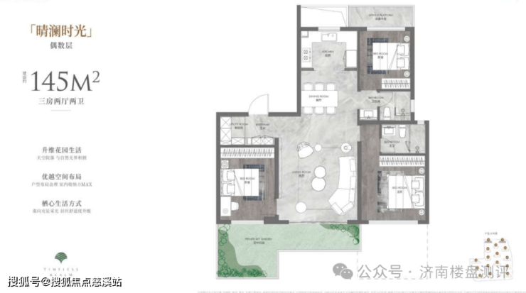 145平米户型位于北侧两栋24层的高层上,两梯两户设计。