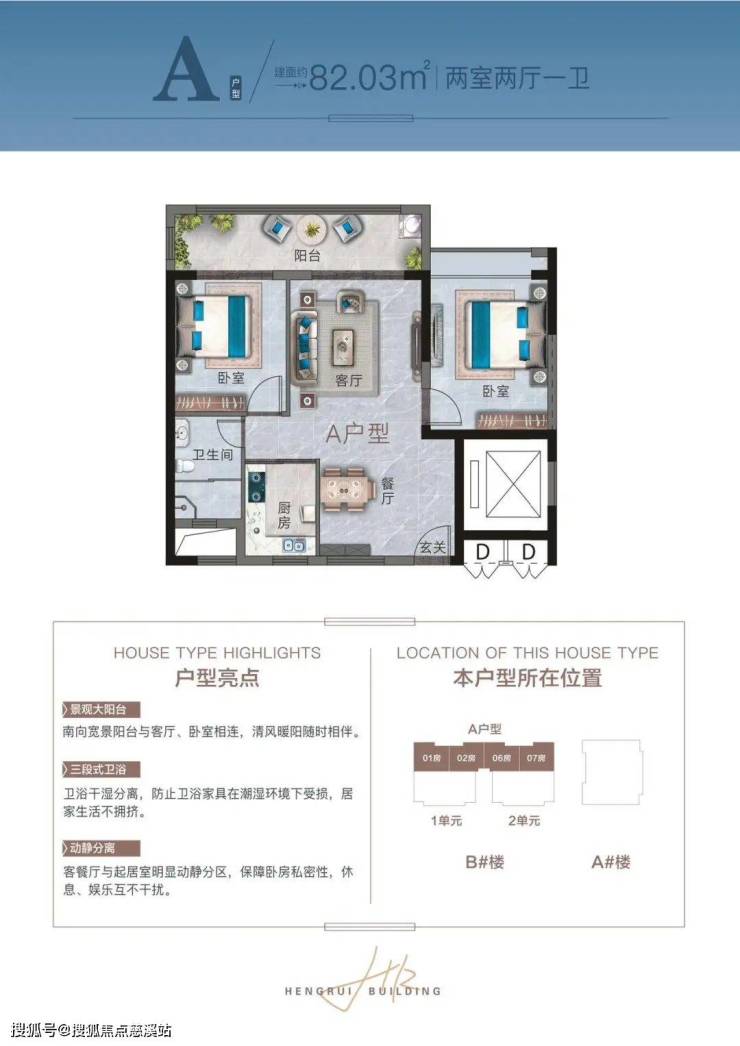 A户型:约82㎡,两房两厅一卫