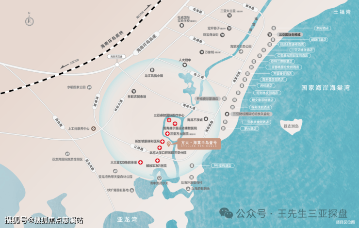 汇聚解放军总医院海南分院、北大口腔医院三亚分院、国寿赫尔曼康复中心、上海嘉麓医院三亚医院(规划中)、方大医院(2026年开工)等顶级医疗力量,串联成全球顶级医疗资源聚合带。 人民大学附属中学三亚学校;杜威国际学校(建设中);确认引进英国国王布鲁顿公学、美国芝加哥大学附属中学;构建从启蒙到国际高中的完整教育路径。