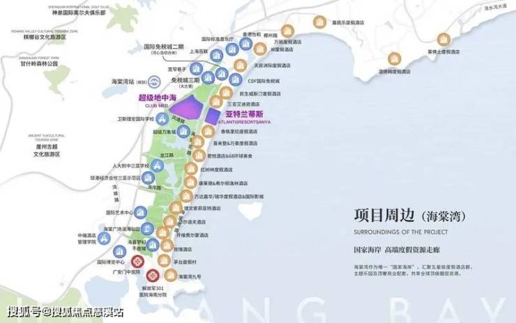 三亚,作为中国唯一的热带海洋岛屿,是全球北纬 18° 滨海旅游胜地之一。而海棠湾更是高端旅居的首选之地,这里汇聚了众多顶级度假资源。全球五星级度假酒店群中已有 20 余家开业运营;世界级主题乐园集群包括亚特兰蒂斯主题乐园、HELLO KITTY 主题乐园、海昌梦幻不夜城等;醇熟商业配套有 CDF 免税店、海棠湾 68 美食广场,以及在建的万象城、太古里、SKP 商场、宽窄巷子等购物中心;国家级重点名校如人大附中三亚学校、卫斯理安国际学校、中瑞酒店管理学院等;文化生态休闲配套包含 2 个高尔夫球场、游艇基地、国际艺术中心、水稻国家公园等;优质医疗机构有解放军 301 医院海南分院、北大口腔医院、广安门中医院等;交通也十分便利,距离海岸线约 2 公里,距海南环岛高速路约 4 公里,未来海棠湾高铁站建成后出行将更加便捷。