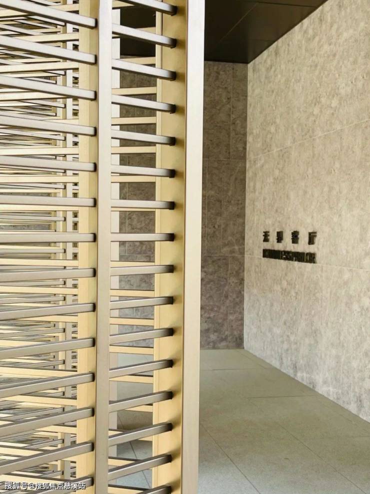 金边勾勒的屏风与园区景色相呼应,每处设计在风格上都能达到统一!穿过售楼处,前后都可以通行至连廊,后院与休息区中间是一排10余米的不锈钢屏风,W型排列,可移动,阳光透过来,更衬园区意境,唯美至极!