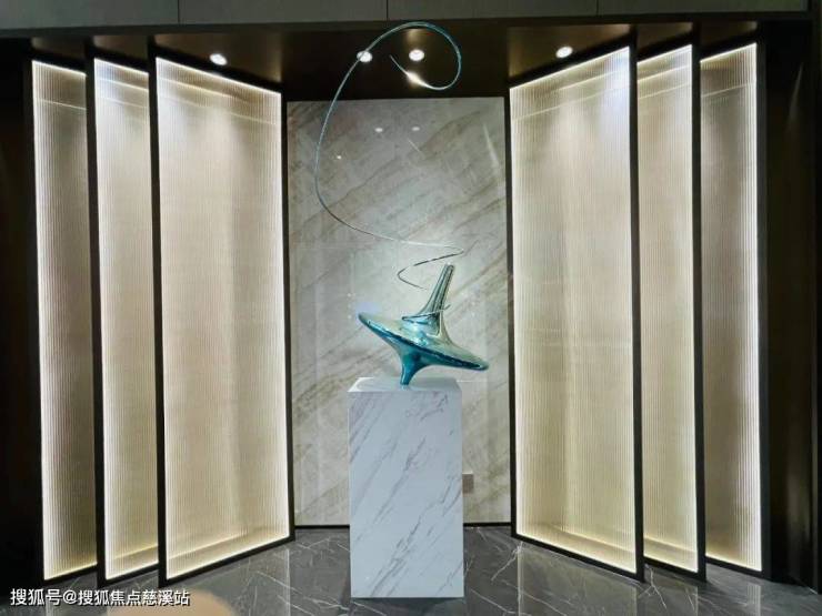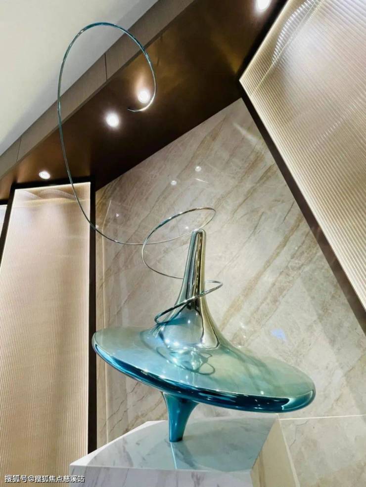 穿过沙盘,中心区域是颇具时尚的镜面雕塑,背景用长虹玻璃金属屏风做衬,风格偏向于轻奢风,通过工艺细节与材料质感提升展示区的品位调性。