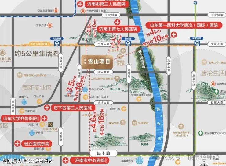 “三横三纵一轨道”路网成熟,三纵:凤鸣路、凤岐路、凤凰路,三横:经十路、飞跃大道、世纪大道;距离地铁R2号线鲍山站仅约800米;距离4大产业区(CBD、高新软件园、汉峪、奥体)约5-8公里,黄金通勤圈。