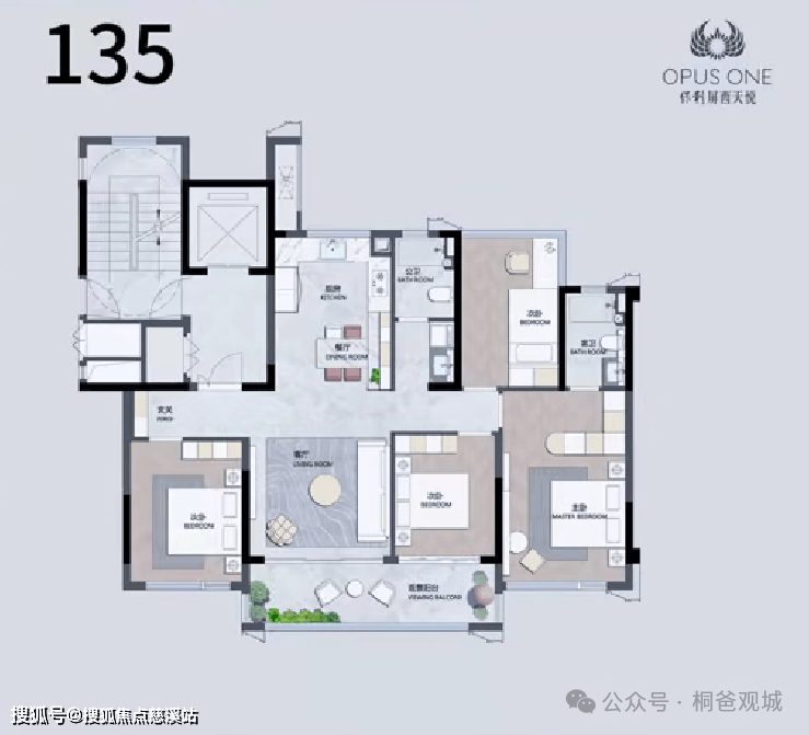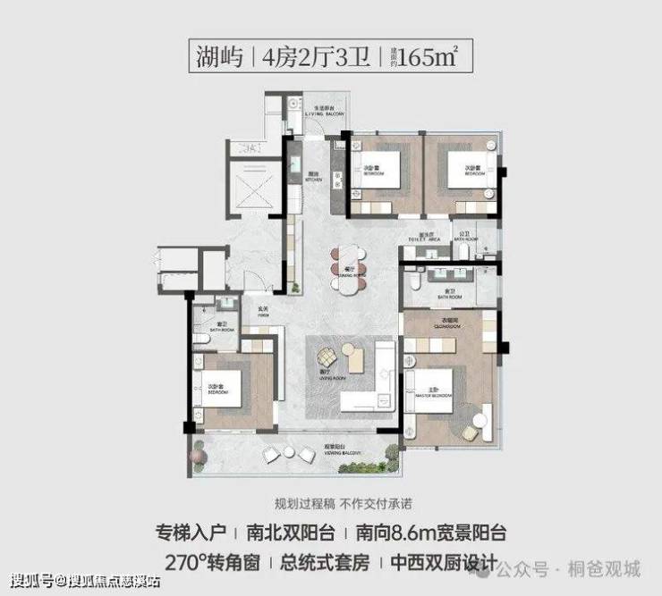 项目整体户型方正,长开间短近深,南北通透,拥有独立的电梯厅,私密性好,带大开间阳台或转角阳台,尺度较舒适。