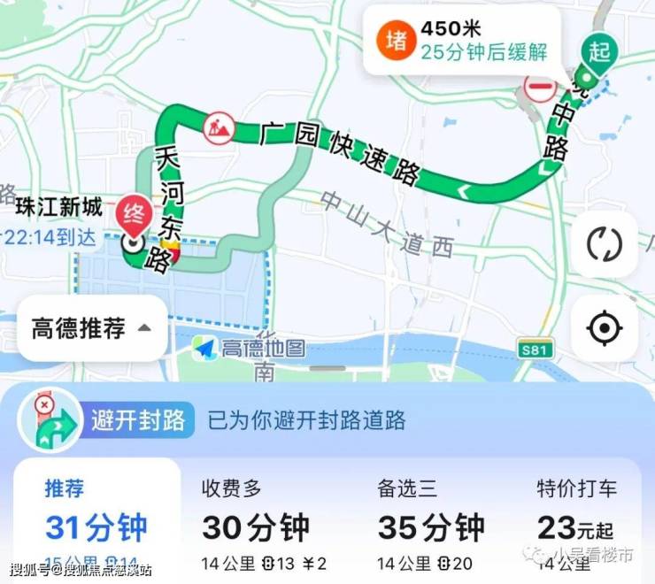 自驾去珠江新城:出小区大观路转到广园快速路,再转天河东路,15公里到珠江新城,耗时31分钟左右。