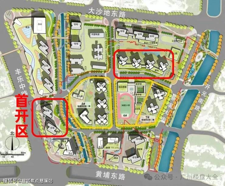 3、教育:自身配建一所12班幼儿园,一所36班小学,初中依靠周边现有配套。目前学校品牌未定,但开发商正与广州前列的学校洽谈,具体还待官宣